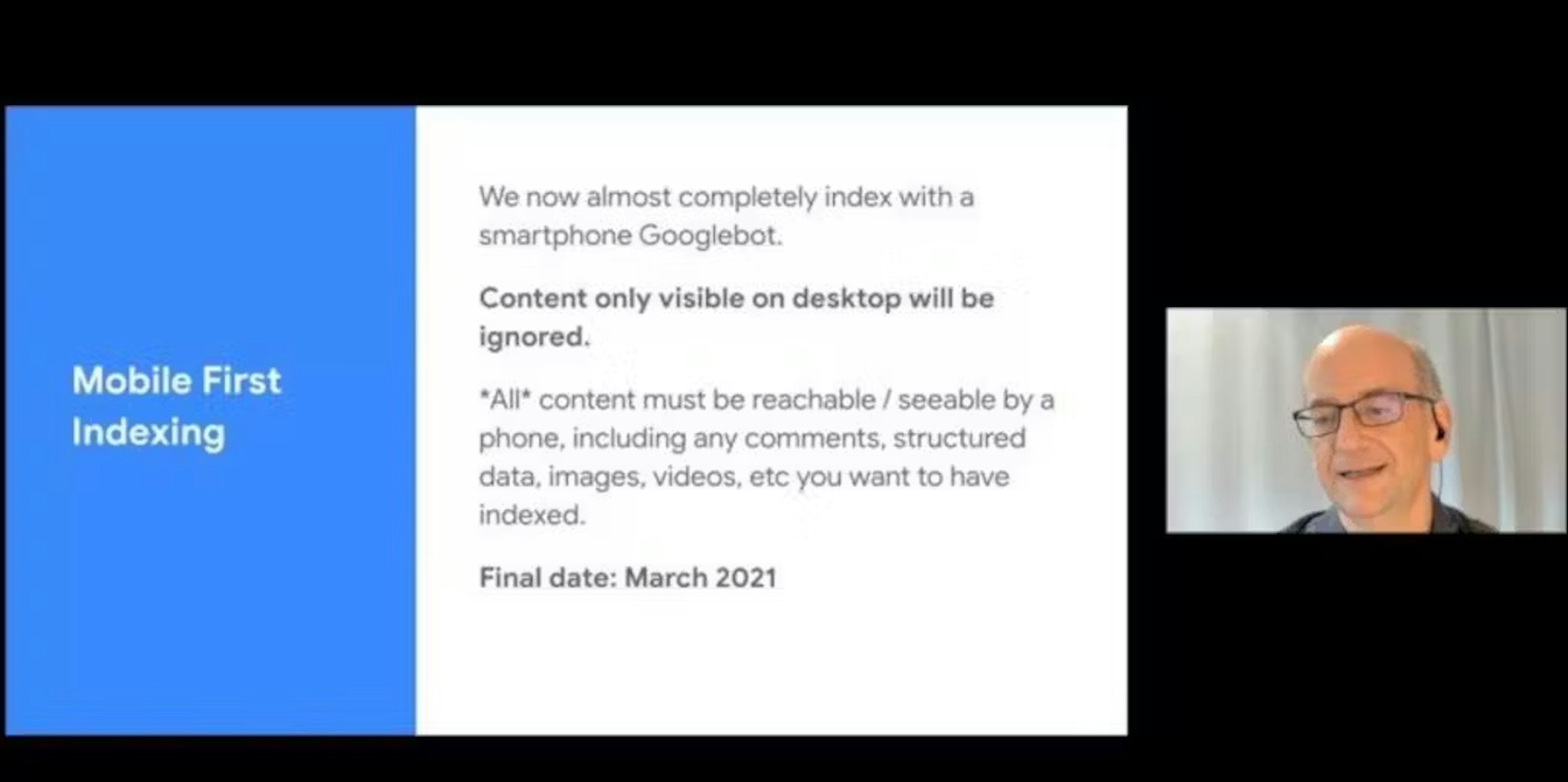 Google's "mobile-first" index means they are looking at your site as if they are on a smartphone. This means if you have a "mobile version" of your site that has less content than your desktop version, it is unlikely to get found. You can find out more about mobile-first indexing here.