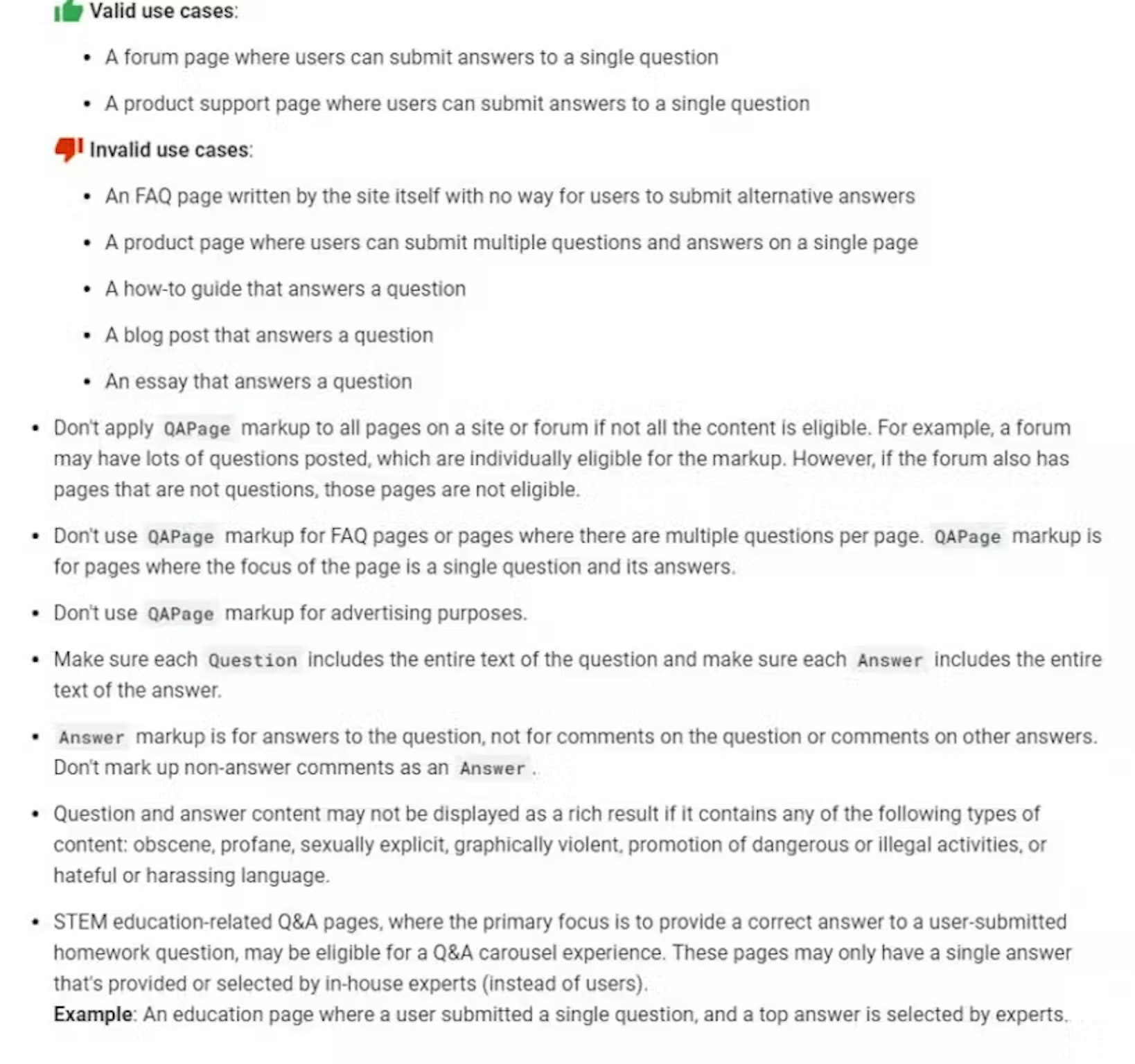 A common mistake I see is websites make is using Q&A schema when they should be using FAQ schema. Q&A schema is for pages that ask one question and where multiple users can submit answers, something like Quora. If you're just writing a list of questions and answers on the page as a site owner, you should use FAQ schema. The image below shows the valid and invalid uses of Q&A schema (QAPage):