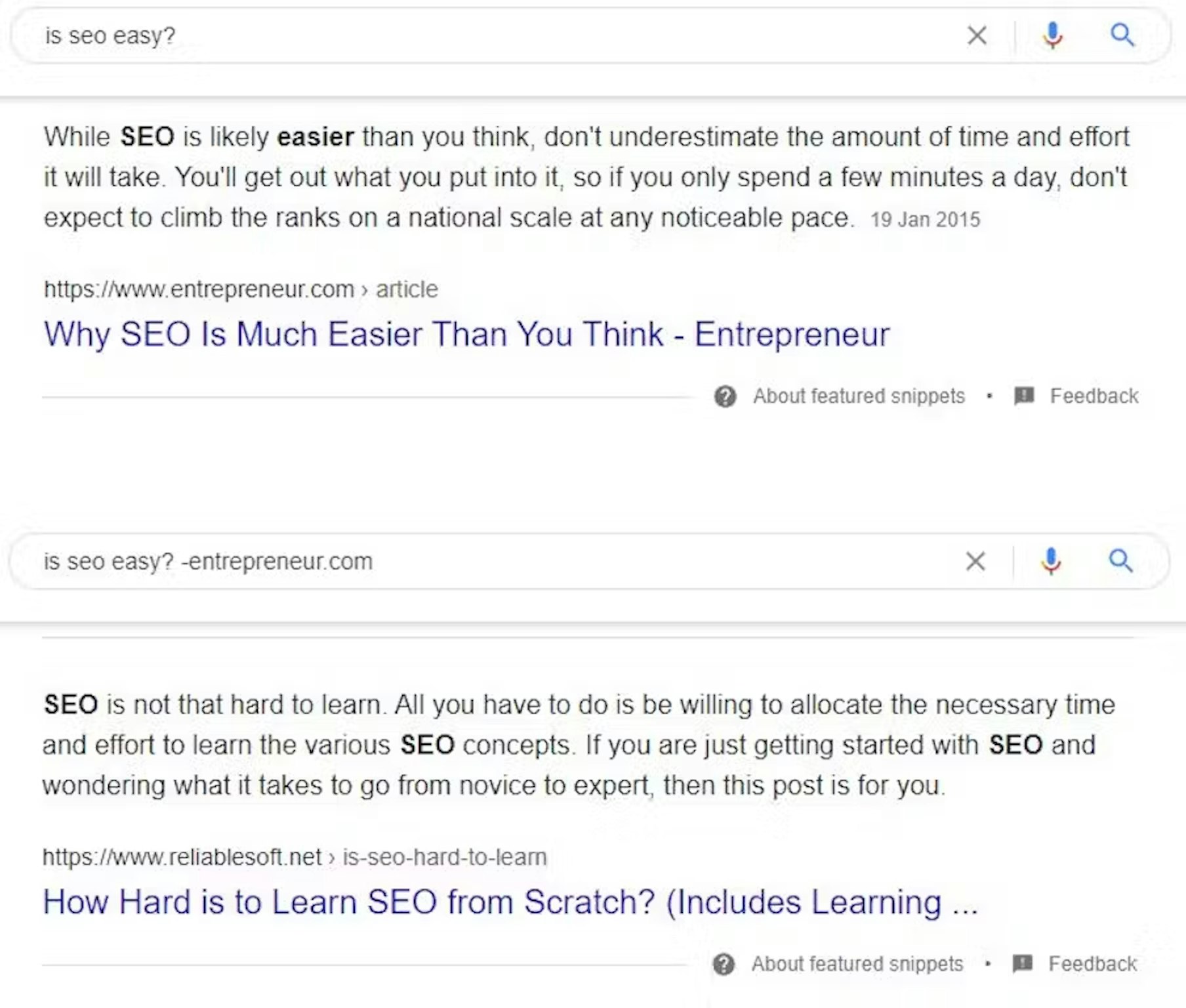 Want to know how close you are to winning a featured result or rich snippet? Here's a little hack: Run the search again and minus off the domain that ranked to see who is next in the "queue". You can minus off multiple sites at once. This used to work with the "site:" operator, which Google stopped - but it works like this now!