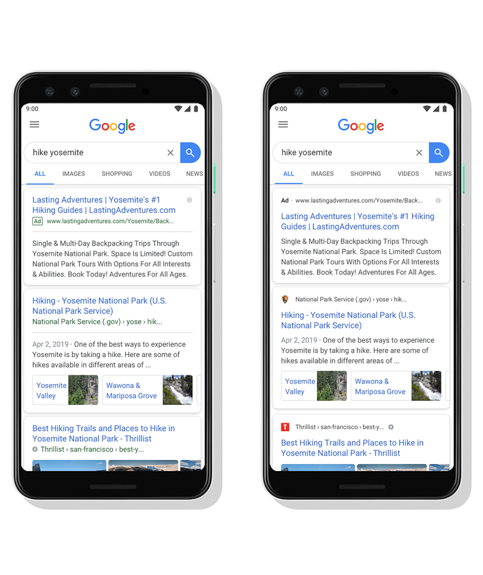 Then they give a helpful link where you can specify your preferred icon for the organic listings, so the way to summarise this is essentially: favicons are coming to Search so you can choose a tiny icon and it's going to go next to the name of your site in the top of the results card, which all sounds good and fine. What is interesting though, and they've put it as the secondary point in the blog post but it's the one I've seen the most conversation about. They're changing how ads appear in Search, so at the moment (and on their screenshots) they show when you run a Google Ads, you get the title at the top and then underneath you get the green ad label and your green URL under, that is the ads we are used to, and these are still really different. I'm sure Rob remembers too, many years ago Google Ads, apart from just having a tiny green box that said ‘ad’, before that it was kind of a full green box that said ‘ad’ and way back when the whole background was a different color.