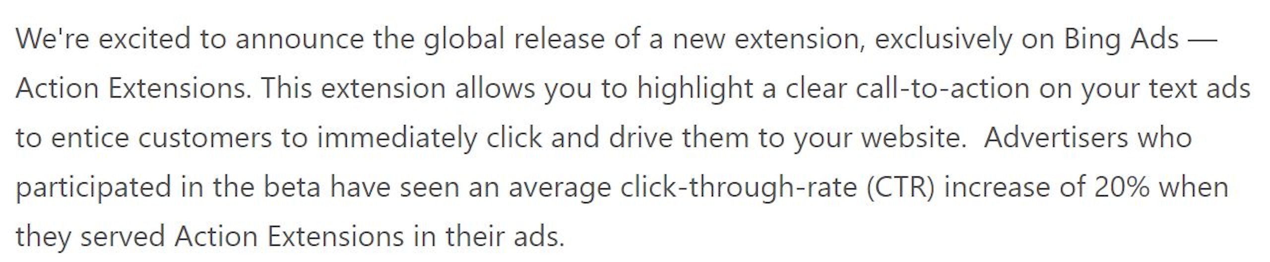 MC: For the listeners, if you are running Bing Ads they've launched quite a major new feature. On April the 3rd on the official Bing Ads blog they posted something titled ‘Drive customers to immediate action with Action Extensions’ and they're go on to say: