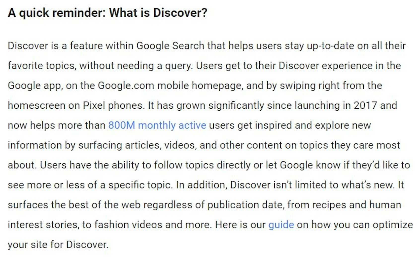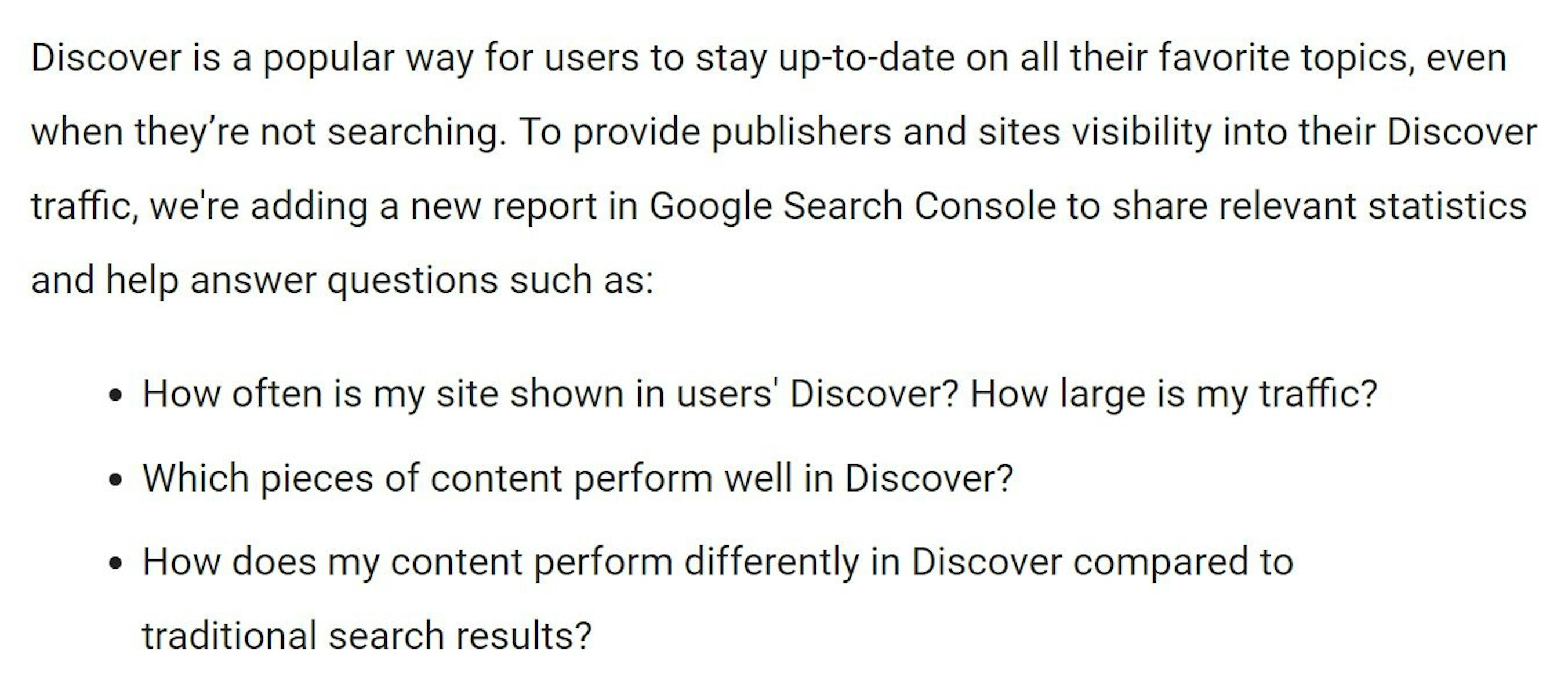 I actually know some sites do actually generate more traffic from Google Discover month on month than they do from normal organic search. There are specific ways you can optimize for discover you can find a link in the show notes as well to Google's advice on how to do that. Here's what Google sang on a new report in Google Search Console: